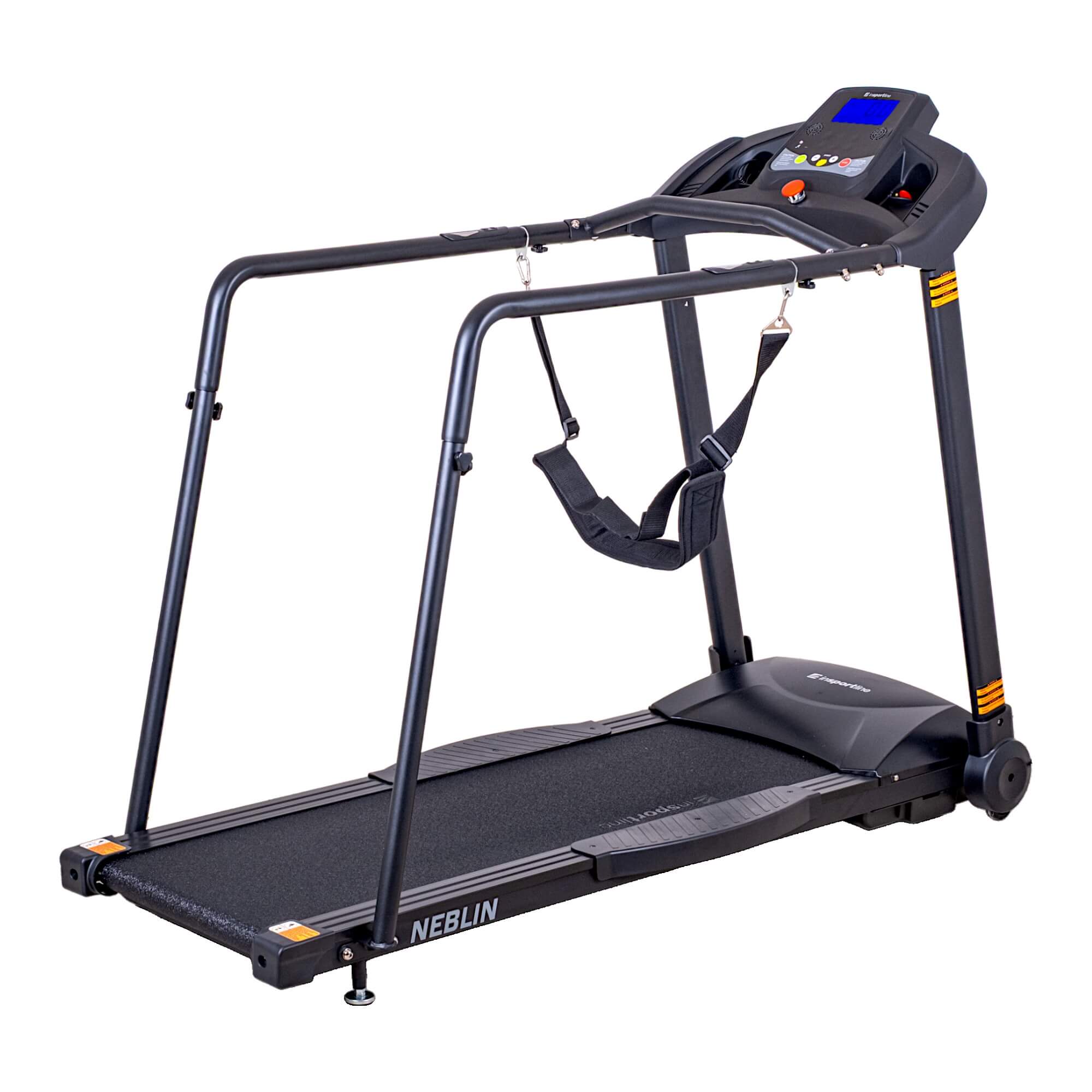 Bežecký pás inSPORTline Neblin je špeciálny domáci bežecký pás vhodný najmä pre chôdzu a rekonvalescenčné účely. Pri chôdzi na páse môžu pomôcť praktické postranné držadlá, ktoré sú vyrobené z mäkkého materiálu. Zaručia istotu pri každom kroku a oporu po celej dĺžke pásu. Ďalšie držadlo nájdete i horizontálne priamo pred Vami. Ďalšou výhodou chodiaceho pásu inSPORTline Neblin je odnímateľný bezpečnostný popruh, ktorý napomáha stabilite. Bezpečnosti napomáhajú aj dostatočne veľké protišmykové nášľapy, ktoré sa nachádzajú po stranách bežeckej plochy. V prípade potreby tak môžete z pásu ľahko odstúpiť. Pás disponuje veľkým bezpečnostným tlačidlom, ktoré v prípade stlačenia pás okamžite zastaví. Súčasťou bežeckého pásu je prehľadný LCD displej, ktorý Vám zobrazí všetky potrebné informácie. Ľahký presun stroja z miesta na miesto zaistia zabudované kolieska. Vďaka týmto vlastnostiam je bežecký pás inSPORTline Neblin vhodný ako pre starších ľudí vyhľadávajúcich bezpečný aktívny pohyb, tak pre zotavovanie po zranení či rekonvalescenciu ľudí s obmedzenou pohyblivosťou. Kľúčové vlastnosti: chodiaci pás predovšetkým pre rekonvalescenčné účely nízka minimálna aj maximálna rýchlosť podporný bedrový pás držadlá po celej dĺžke chodiacej plochy – vo výške 89,5 cm 60 cm priestor medzi držadlami jednoduché ovládanie a prehľadný podsvietený displej reproduktory veľké bezpečnostné tlačidlo pre okamžité vypnutie pásu pridávanie a uberanie rýchlosti v krokoch po 0,1 km/h Silent Motion Technology: tichý chod motora bežeckého pásu Touch & Run ovládanie: dôležité funkčné tlačidlá sú umiestnené aj na postranných držadlách, a navyše odštartovať aj ukončiť tréning dokážete jedným tlačidlom počítač zobrazuje: čas, vzdialenosť, rýchlosť, kalórie, tepovú frekvenciu Technický popis: výkon motora 1,75 HP rozmery bežeckej plochy 122 x 40 cm zdvih bežeckej plochy (sklon) bez zdvihu počet stupňov sklonu bežeckej plochy 0 stupňov maximálny sklon bežeckej plochy X rýchlosť 0,3 – 6 km/h vhodný pre chôdzu áno, bez obmedzenia celkový počet programov 1 prednastavené programy nie používateľské programy nie HRC program nie manuálny program áno snímače tepovej frekvencie áno držiak na fľašu áno stojan na tablet nie transportné kolieska áno systém vyrovnania nerovností áno odpruženie Silent Block bezpečnostná brzda áno prijímač hrudného pásu nie hrudný pás súčasťou balenia nie audio vstup áno sklápacia konštrukcia nie celkové rozmery stroja v129 cm x š68 cm x d159 cm rozmery v sklopenom stave X rozmery balenia d166 cm x š72 cm x v29 cm maximálna nosnosť 130 kg (nosnosť držadiel: 100 kg) hmotnosť 46 kg zdroj napájania 220V, 230V kategória HC (podľa EN ISO 20957) použitie domáce