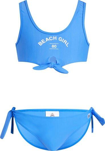 Dvojdielne plavky na plávanie, pádlovanie alebo hranie na brehu ponúkajú jednoduché nosenie a zábavný štýl pre deti, ktoré sú vždy aktívne. Strečová zmes polyesteru a elastanu Vrchný diel v štýle halter so zábavnými falošnými mašľami Materiál: 83% Polyamid, 17% Elastan