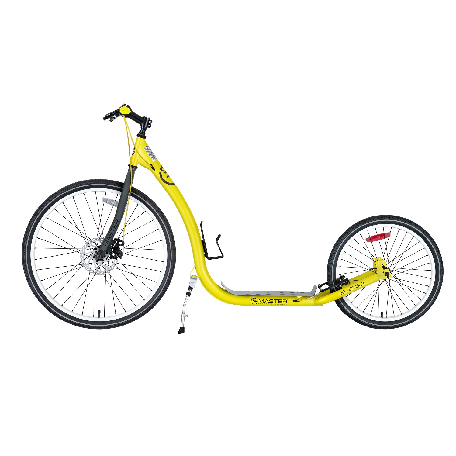 Kolobežka MASTER 26-20 GLX s kotúčovou brzdou má veľký a veľmi stabilný rám. Kolobežka je vďaka veľkým kolesám určená pre rýchlu jazdu na rovnom povrchu, prípadne aj jazdu v miernom teréne. Kolobežky MASTER spĺňajú najvyššie bezpečnostné štandardy.