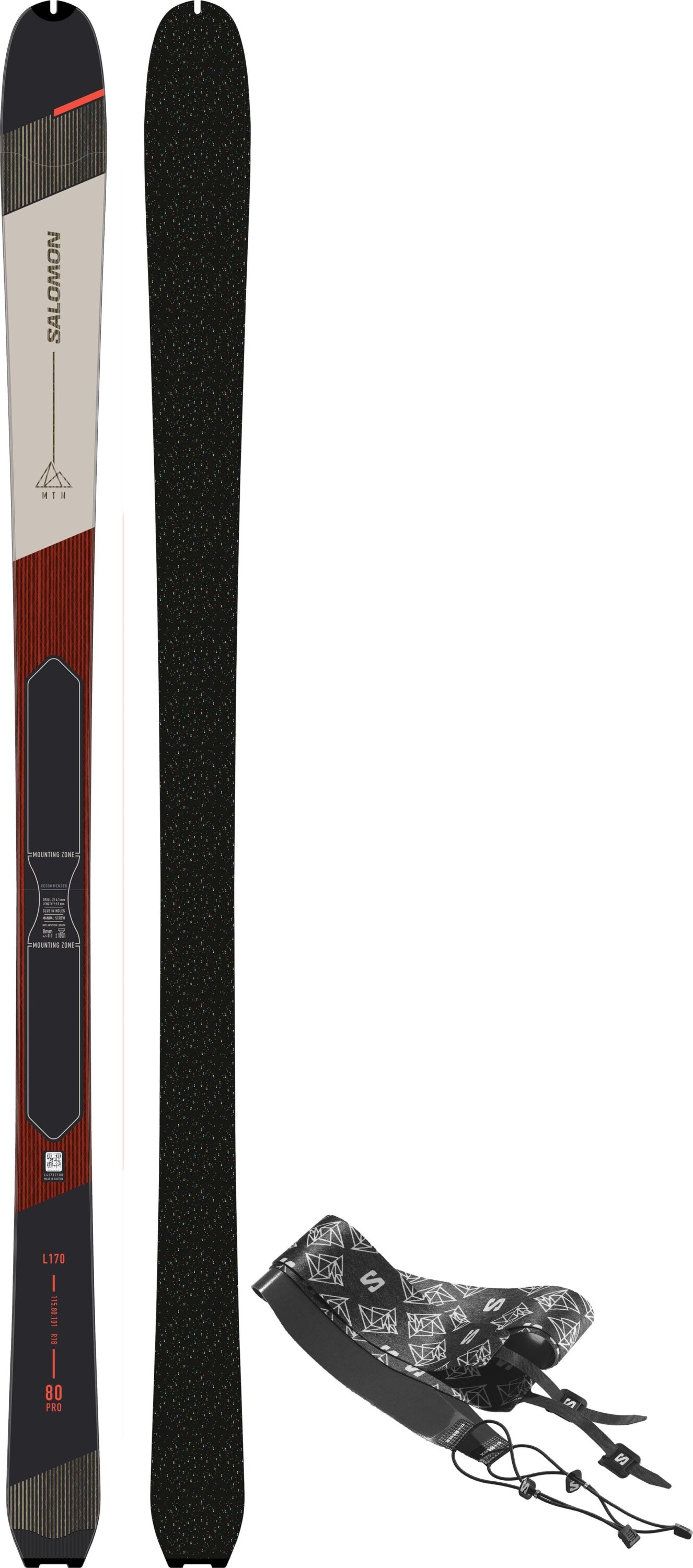 Unisex skialp lyže Salomon MTN 80 Pro sú navrhnuté pre lyžiarov, ktorí túžia po nových zručnostiach. Lyža je ľahká (1145g pre 164cm) a obratná, na ktorú chcete naskočiť, keď je na svahoch rušno a je čas odísť z davov. Je vybavená recyklovanými odolnými materiálmi, ktoré znižujú dopad na životné prostredie. Touring efektivita: S hmotnosťou 1145g pre 164cm a dobre vyváženým profilom táto lyža uľahčuje udržiavanie perfektnej polohy a podporuje neplytvanie energiou Modelový rok: 2022/2023 Prispôsobivý alpine výkon: Tradičný All Mountain tvar tejto lyže zaisťuje, že si môžete užiť zjazd bez ohľadu na to, či schádzate zo svahu alebo objavujete novú líniu v backcountry Udržateľnejšie materiály: vyrobené tak, aby boli až zo 40 % udržateľných materiálov. Tieto lyže sú súčasťou neúnavného úsilia spoločnosti Salomon o udržateľnosť, ktorého cieľom je minimalizovať vplyv nášho produktu na životné prostredie Celé topoľové drevené jadro: Celodrevené jadro maximalizuje živosť, stabilitu a kontakt lyží so snehom a zároveň filtruje vibrácie Korkový tlmič: Korok má trikrát vyššiu absorpciu ako Koroyd. Jeho použitie v špičke lyže umožňuje vysokú úroveň absorpcie a tlmenia vibrácií pri ešte menšej hmotnosti Skin Tail Clip: Predrezaný zárez v päte lyže umožňuje rýchle, jednoduché a bezpečné pripevnenie pásu All Terrain Rocker: Rocker tip, camber pod viazaním Monocoque: Jednovláknová vrstva štruktúruje lyžu a robí ju odolnejšou. Je ľahký, odpúšťajúci a uľahčuje manévrovanie Tail Rocker Profile: 12 %, Tip Rocker Profile: 15 % Sidecut: 113/80/99mm (164 cm) Radius: 17m (164 cm) Hmotnosť: 1145g (164cm) V cenu sú aj pásy SKINS MTN. Vysoko kvalitné pásy, nie sú potrebné žiadne ďalšie úpravy. Sú vyrobené zo 65% mohéru, 35% polyamidu pre skutočne silné držanie pri stúpaní a sú veľmi odolné a dlhotrvajúce. Hydrofóbna membrána.